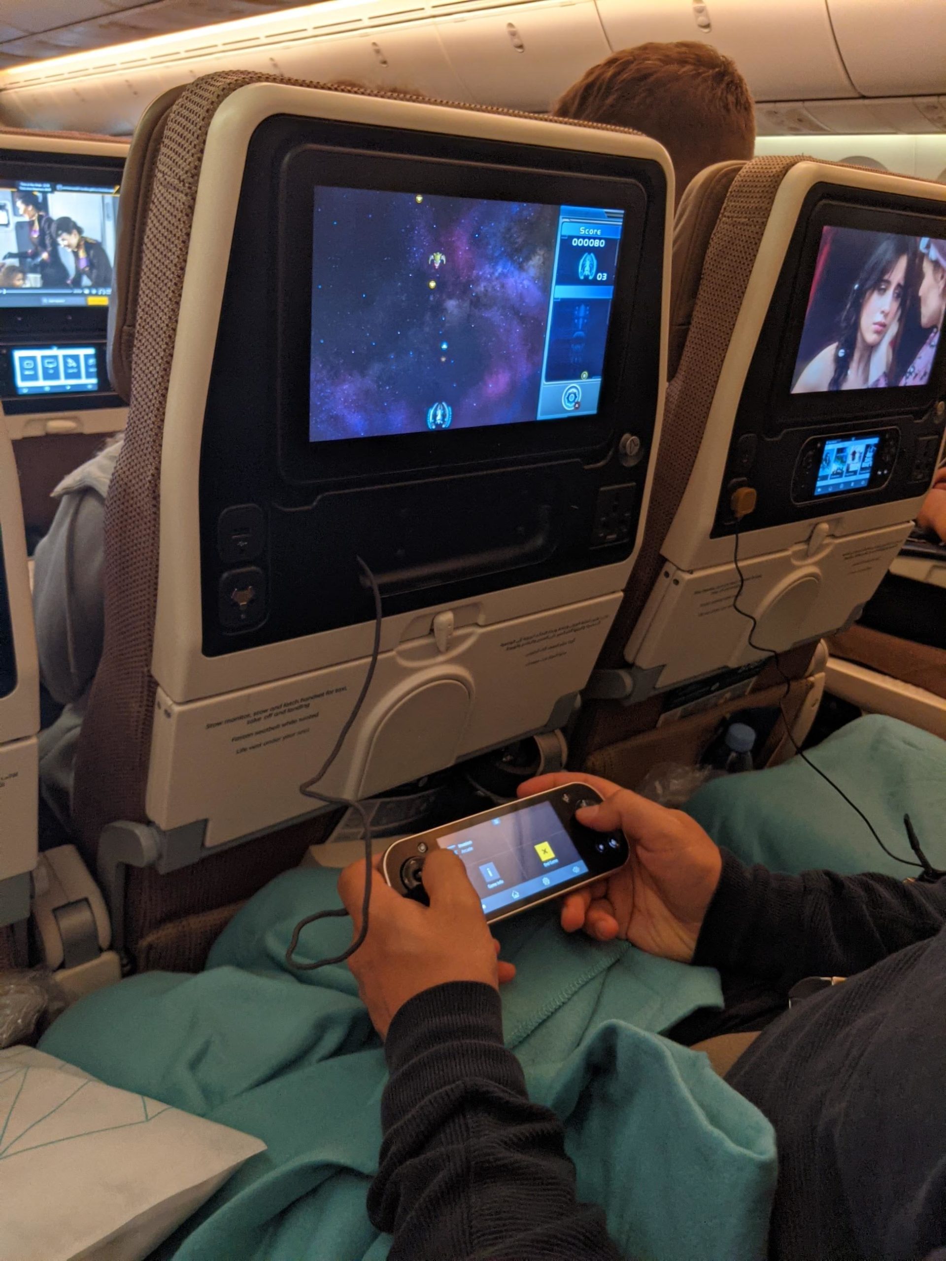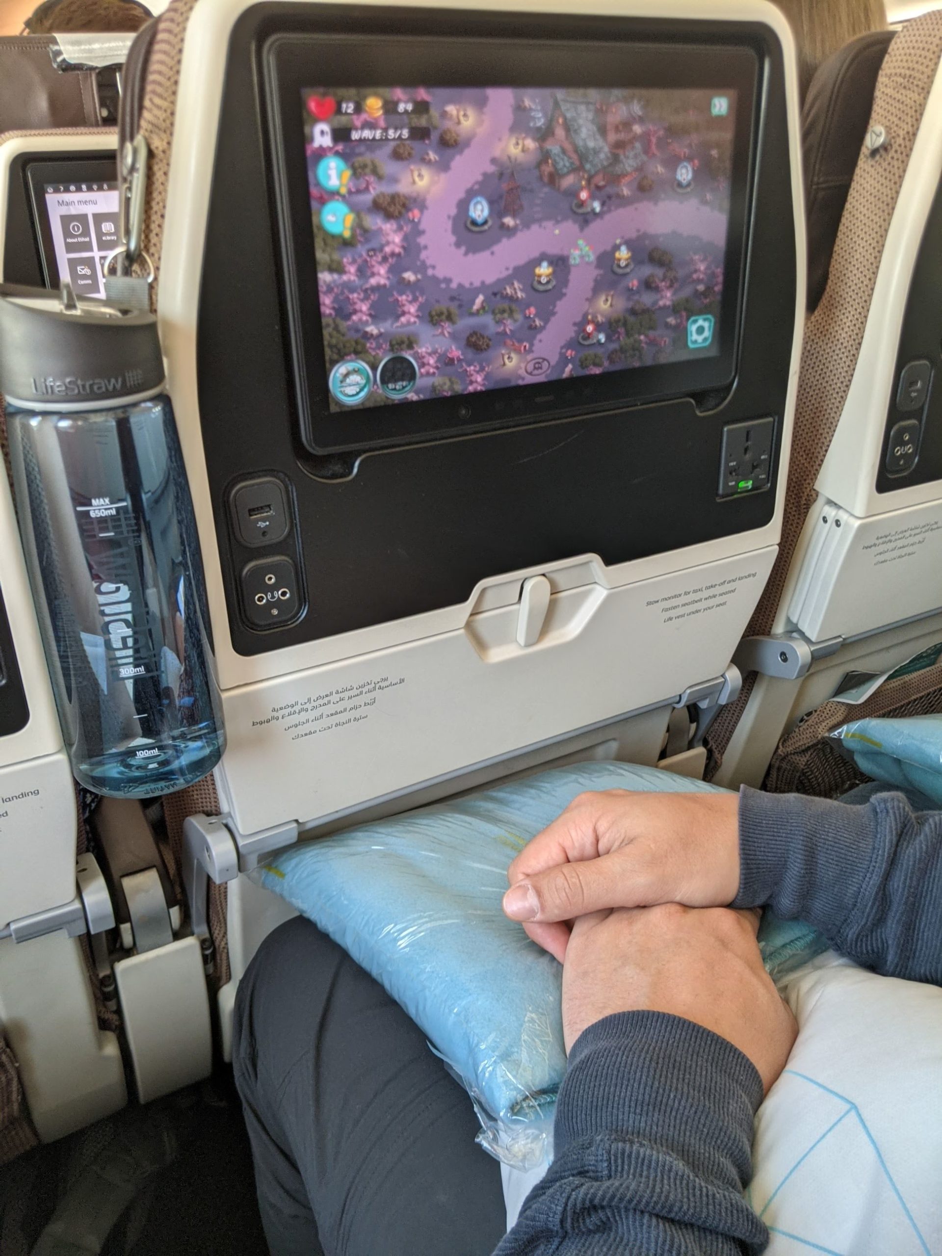 Über Abu Dhabi und Kuala Lumpur ging es für uns innerhalb 25 Stunden nach Denpasar. Man muss schon sagen, dass ein bequemes Bett zum Übernachten wirklich schöner ist als Flugzeugsitze (kaum Beinfreiheit für Hannes) oder Bänke am Flughafen. Das Essen in den Fliegern war prima und Hannes war mit Gaming auch bespaßt 🙂 Vanessa hat natürlich vieles verschlafen! (Weil sie immer und überall schlafen kann)