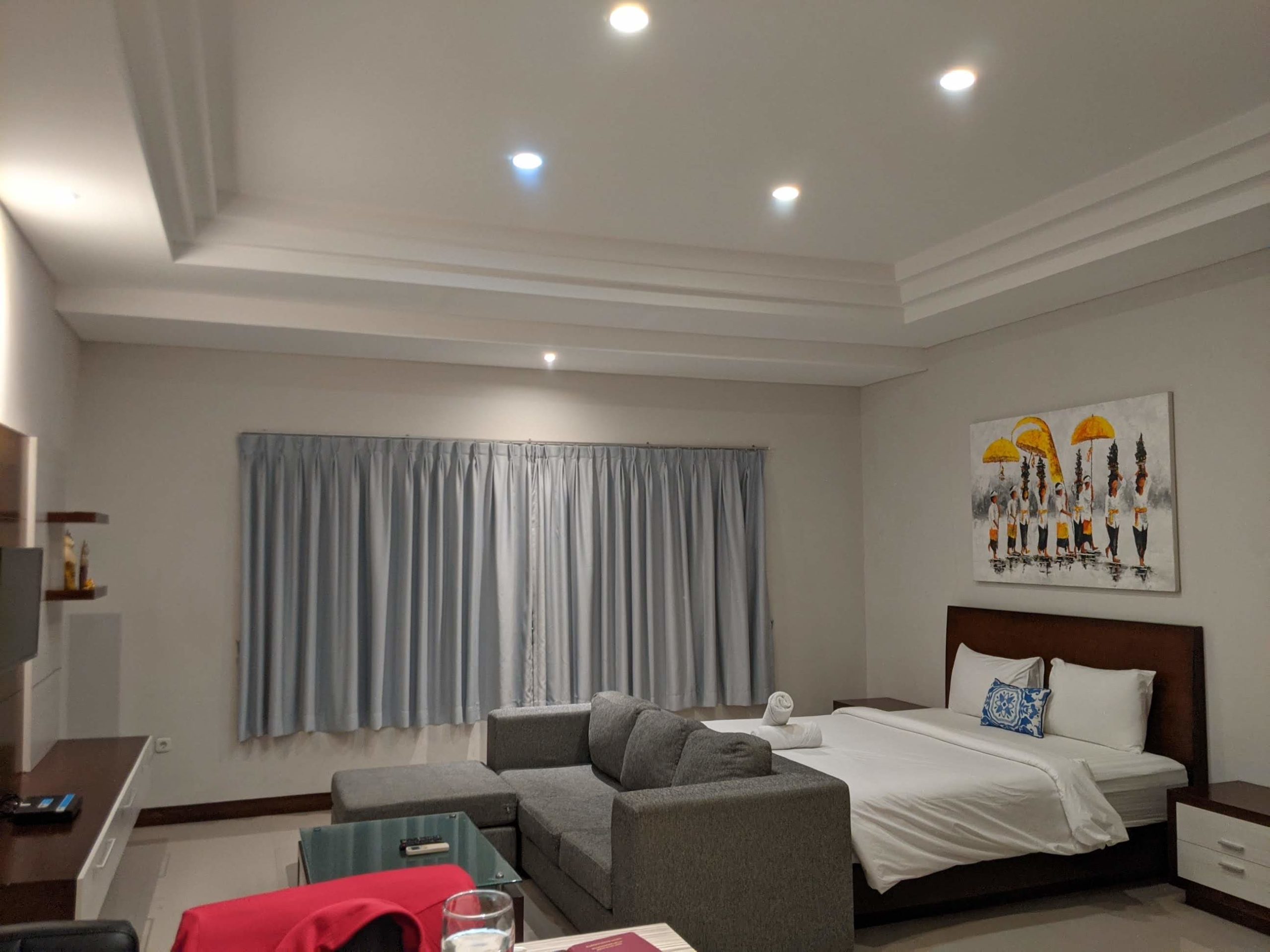 In Denpasar gelandet, gab es gleich ein großes Überraschungspaket für uns: Kontrolle Impfung nur 2 Minuten, Visabeantragung nur 2 Minuten, Passkontrolle nur 3 Minuten und zu guter Letzt: Unser aufgegebene Rucksack hatte es wider Erwarten tatsächlich mit uns gemeinsam nach Bali geschafft. Freudig und beeindruckt wurden wir von Putu, unserem Fahrer, ans Hotel gebracht. Tiefenentspannt mit dem Auto, umfahren von vielen Rollern, zwischen kleinen Gassen hindurch, und das ganz ohne Gehupe!