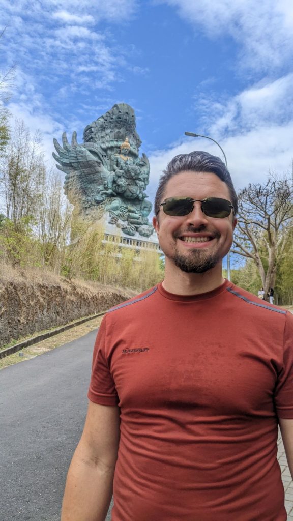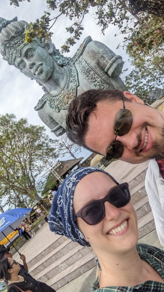 Nach einer guten Erholungsrunde fuhren wir erneut nach Bukit los, um „Garuda Wisnu Kencana“ zu besuchen. Das ist eine über 120 Meter hohe Statue des Gottes Wisnu, der auf dem mystischen Adler Garunda sitzt. Sie wurde 2018 erbaut und zählt zu den größten Statuen der Welt. Als Wahrzeichen der Halbinsel ist sie noch kilometerweit, auch von unserem Strand aus, zu sehen. Da am Nachmittag Spa für Vanessa anstand (3 Stunden Massage und Peeling! <3 ), machten wir uns auf den Rückweg. Hier hielten wir noch am Strand „Jimbaran Beach“, einer größeren Bucht der Westküste. Dort schafften wir es das erste Mal nicht nur die Zehen ins Wasser zu strecken, sondern auch ganz ins Meer zu hüpfen. Nachmittags ließ Vanessa sich im Spa verwöhnen, während Hannes unsere Wäsche waschen ließ und sich die ersten Verletzungen beim Plantschen im Meer zuzog. (Hannes Formulierung: Ich war ganz heldenhaft verfetzt in meterhohen Wellen unterwegs! – Es war bestimmt irgendwas dazwischen 😀 ) Kilometerstand: 37 Kilometer, schadenfrei, Hannes leicht verletzt.