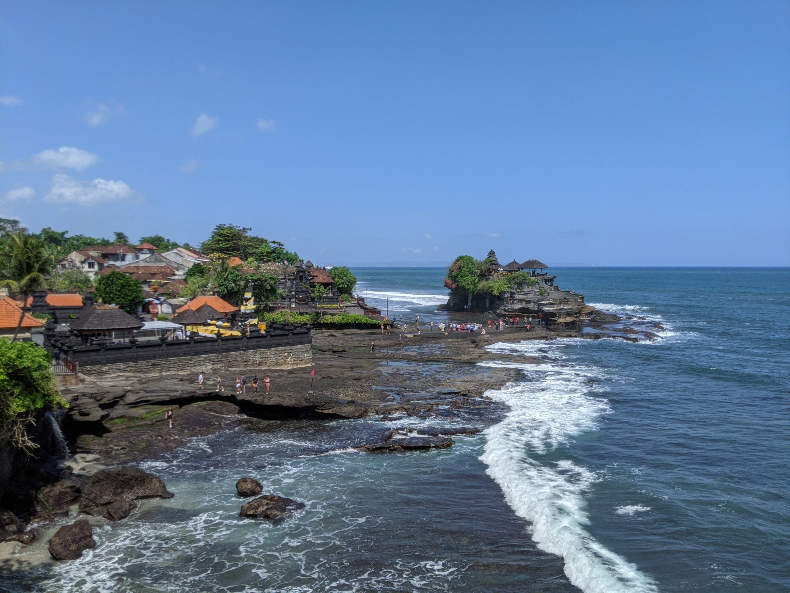 „Pura Tanah Lot“ ist ein ca. 500 Jahre alter Bereich mit einigen Tempelanlagen, die größtenteils auch heute noch in Benutzung sind. Besonders sehenswert ist hier ein Tempel auf einem Felsen, der etwas abseits im Meer trohnt. Nur wenn das Meer sich zurück zieht, wird ein Weg freigelegt, über den man auf die Tempelanlage auf dem Felsen gelangt. Die meiste Zeit ist dieser allerdings nicht zu erreichen. Schwimmend besser auch nicht, da die Wellen meterhoch gegen die Felsen schlagen.