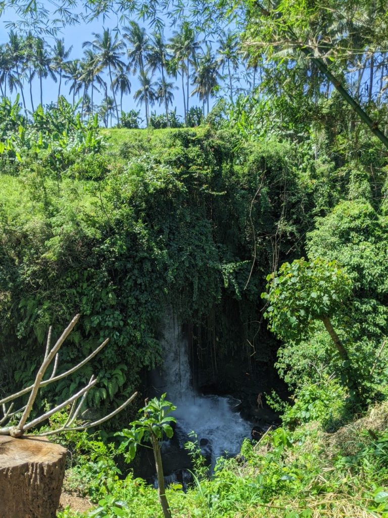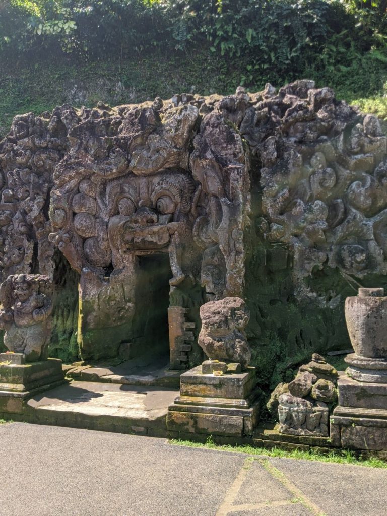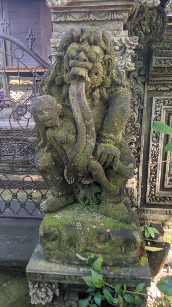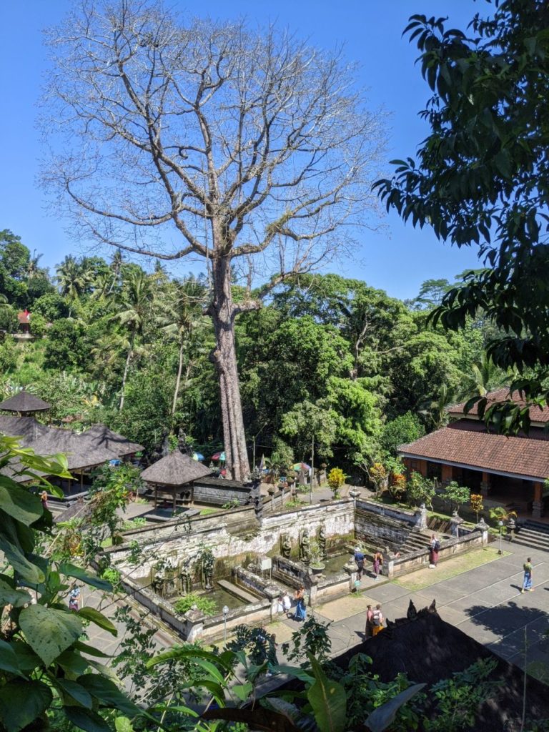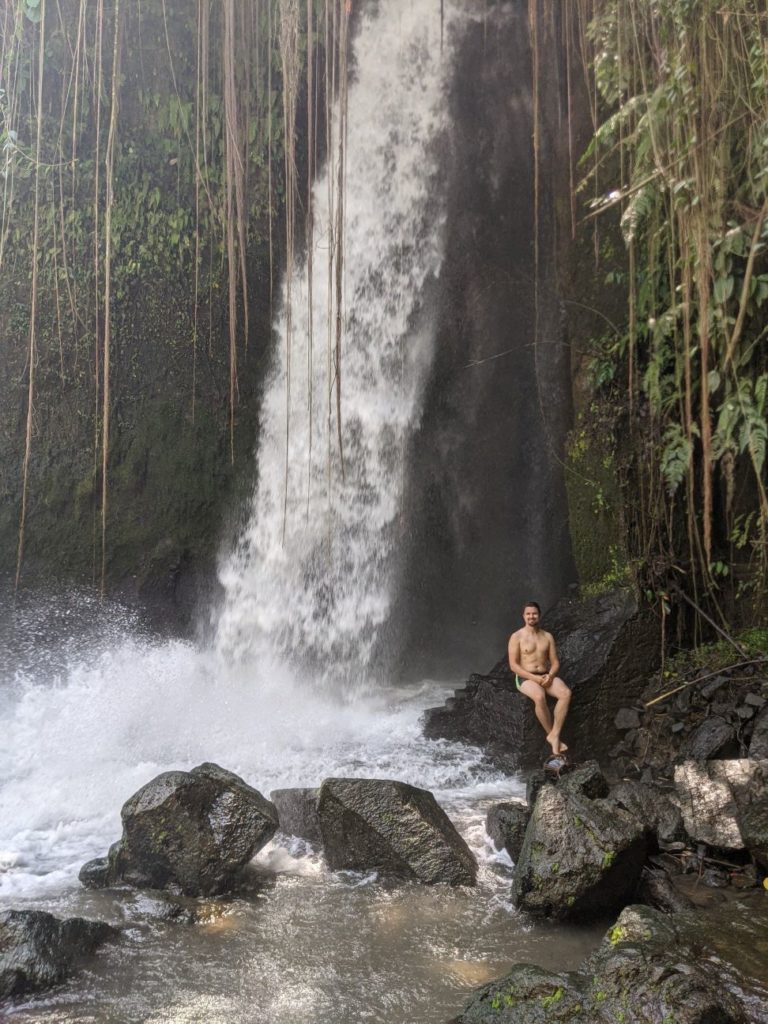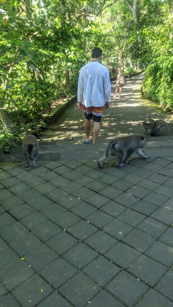 Nach unserer Erkundung der Innenstadt Ubuds mieteten wir uns erneut einen Roller für die nächsten Ziele. Zuerst peilten wir den Südwesten von Ubud an. Um zum „Sumampan“ Wasserfall zu gelangen mussten wir einen kurzen Marsch durch den Wald hinlegen und einige steile Stufen hinab an den Fluss steigen. Dort konnten wir an einer Leine, die über den Fluss führt, bis zum Wasserfall gelangen. Was für eine Erfrischung bei den Temperaturen! Am Tempel von Goa Gajah entdeckten wir schöne Steinskupturen und fanden auch einen tollen Magneten für unseren Kühlschrank. Hier merkte man bei den einheimischen Verkäufern stark die letzten zwei Jahre ohne Einkommen: Um jeden Touristen wurde hart gekämpft! Als letzte Station wählten wir den Monkey Forrest direkt in Ubud, denn es wurde langsam Abend. Der Monkey Forrest ist ein Waldareal, in dem wilde Affen leben. Auf schön angelegten wegen kann man dieses Areal besichtigen. Natürlich trafen wir auf den ein oder anderen Affen, der ein bisschen frecher unterwegs war und gerne den ein oder anderen Touri besprang. Besonders interessant waren Rucksäcke. Wir haben unsere Taschen im Scooter gelassen und waren sehr unspektakulär für die Affen! In diesem Affenwald gibt es auch einen Friedhof für Einheimische, den wir besichtigen konnten. Am Vormittag hat dort eine Zeremonie der Verbrennung stattgefunden. Vor dem Abendessen gönnten wir uns noch eine Verschnaufpause am Pool. Dann ließen wir es uns nochmal so richtig gut gehen und bestellten uns in einem balinesischen Restaurant eine Platte mit allerlei köstlichem Essen! Was das alles genau war, können wir nicht sagen, aber gemundet hat es sehr!