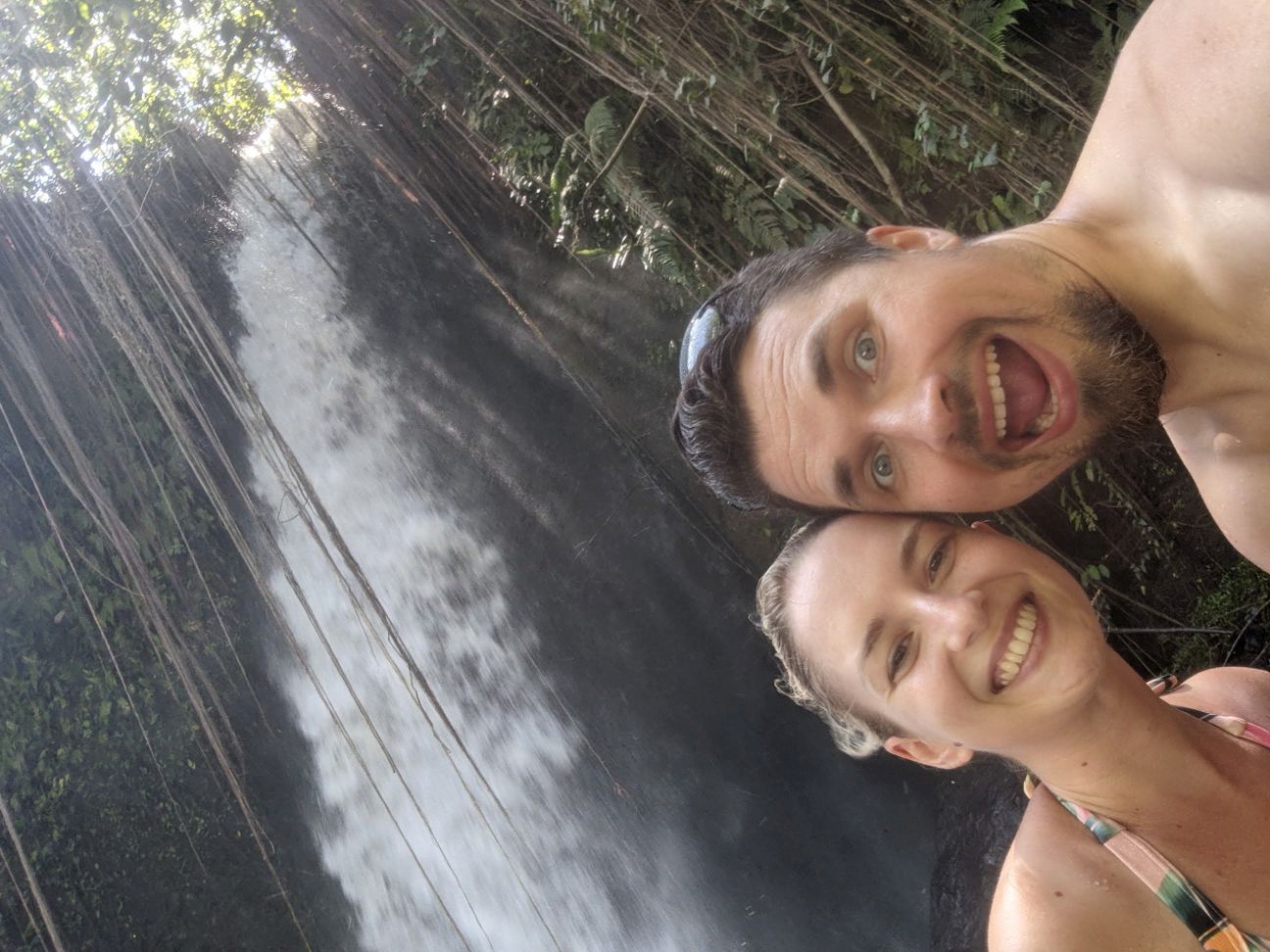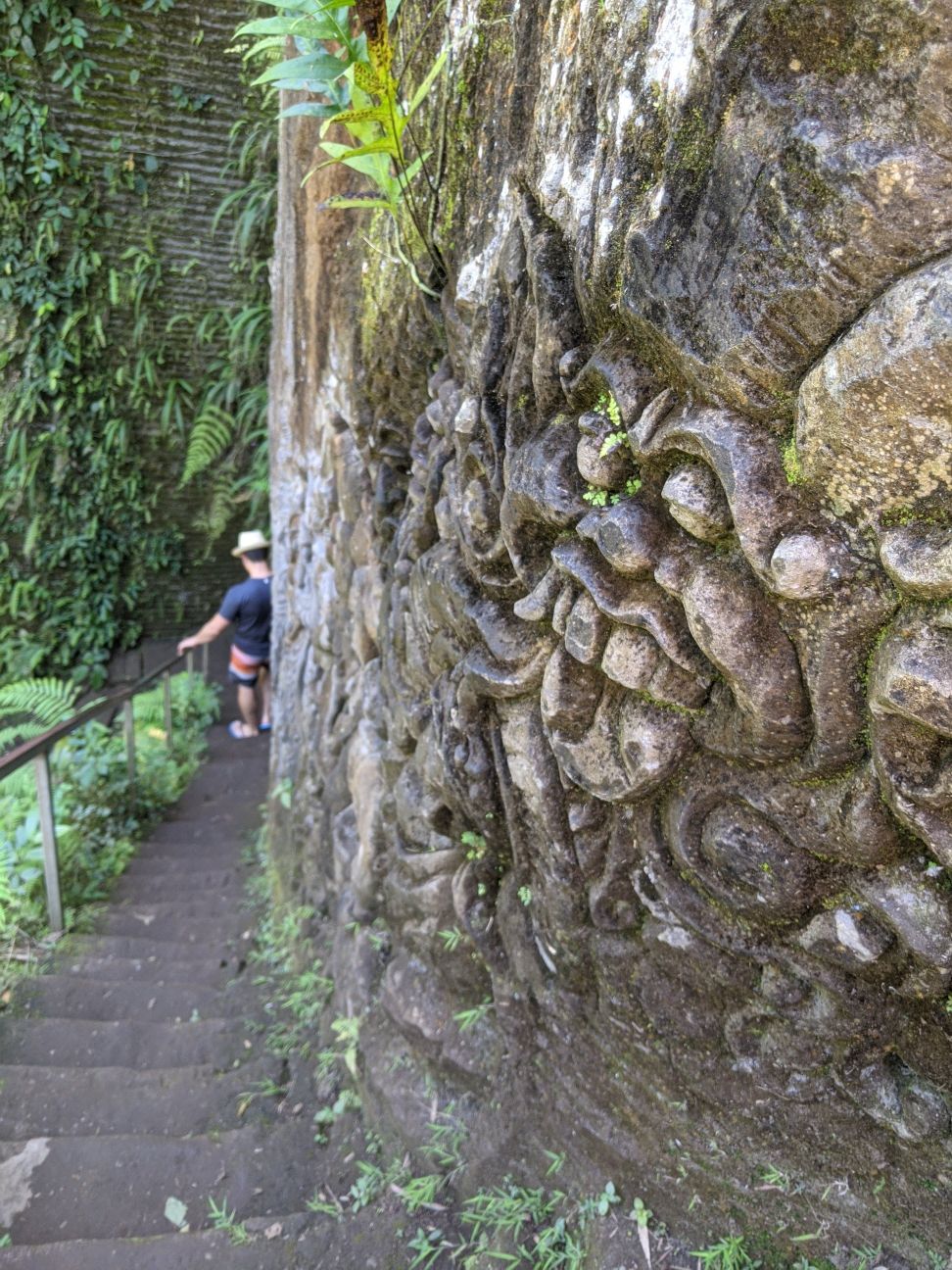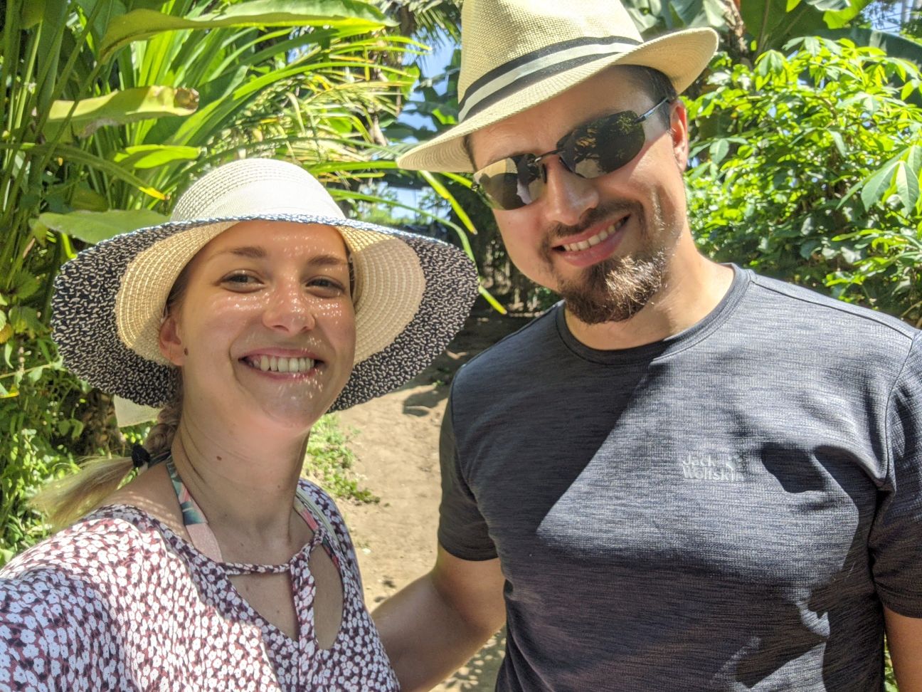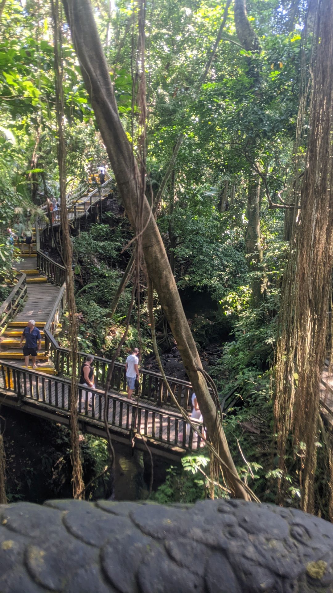 Nach unserer Erkundung der Innenstadt Ubuds mieteten wir uns erneut einen Roller für die nächsten Ziele. Zuerst peilten wir den Südwesten von Ubud an. Um zum „Sumampan“ Wasserfall zu gelangen mussten wir einen kurzen Marsch durch den Wald hinlegen und einige steile Stufen hinab an den Fluss steigen. Dort konnten wir an einer Leine, die über den Fluss führt, bis zum Wasserfall gelangen. Was für eine Erfrischung bei den Temperaturen! Am Tempel von Goa Gajah entdeckten wir schöne Steinskupturen und fanden auch einen tollen Magneten für unseren Kühlschrank. Hier merkte man bei den einheimischen Verkäufern stark die letzten zwei Jahre ohne Einkommen: Um jeden Touristen wurde hart gekämpft! Als letzte Station wählten wir den Monkey Forrest direkt in Ubud, denn es wurde langsam Abend. Der Monkey Forrest ist ein Waldareal, in dem wilde Affen leben. Auf schön angelegten wegen kann man dieses Areal besichtigen. Natürlich trafen wir auf den ein oder anderen Affen, der ein bisschen frecher unterwegs war und gerne den ein oder anderen Touri besprang. Besonders interessant waren Rucksäcke. Wir haben unsere Taschen im Scooter gelassen und waren sehr unspektakulär für die Affen! In diesem Affenwald gibt es auch einen Friedhof für Einheimische, den wir besichtigen konnten. Am Vormittag hat dort eine Zeremonie der Verbrennung stattgefunden. Vor dem Abendessen gönnten wir uns noch eine Verschnaufpause am Pool. Dann ließen wir es uns nochmal so richtig gut gehen und bestellten uns in einem balinesischen Restaurant eine Platte mit allerlei köstlichem Essen! Was das alles genau war, können wir nicht sagen, aber gemundet hat es sehr!