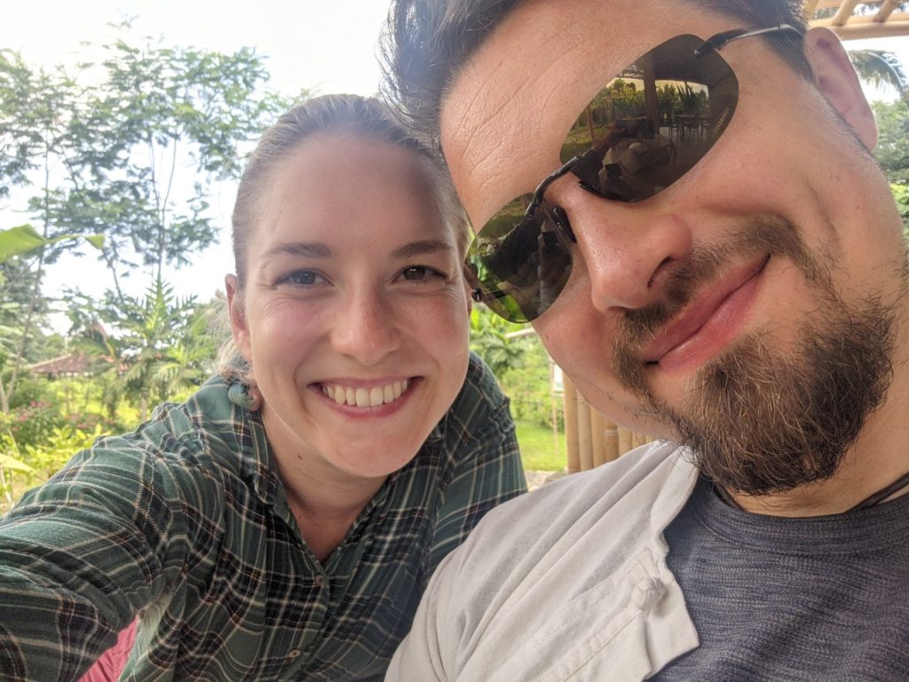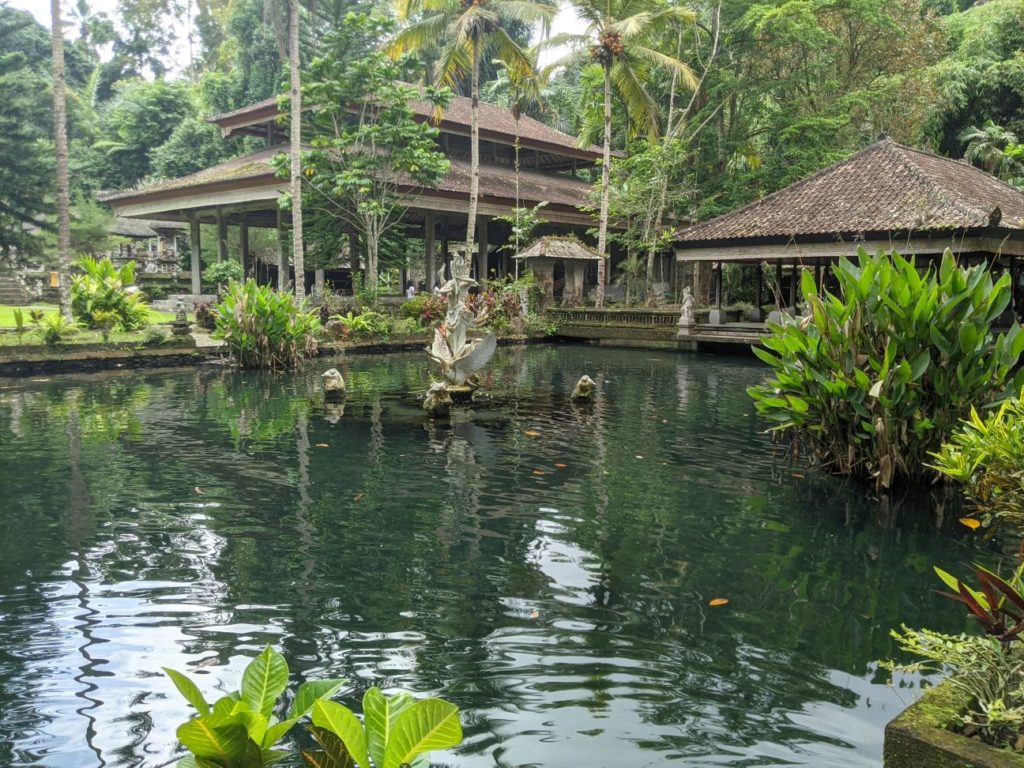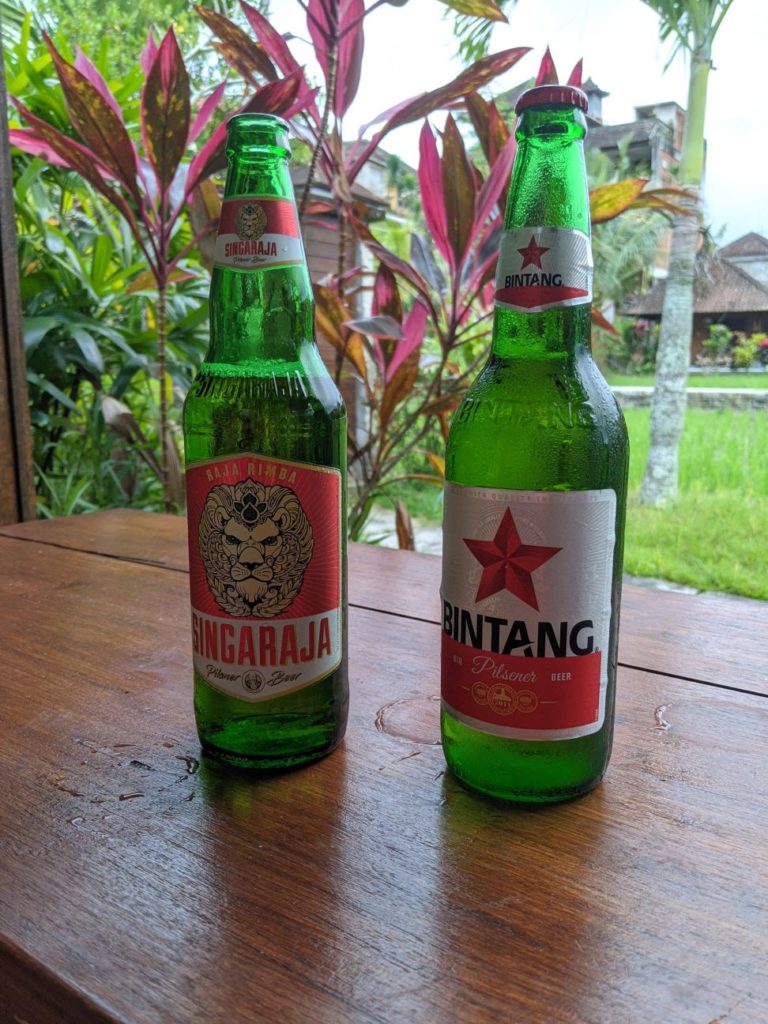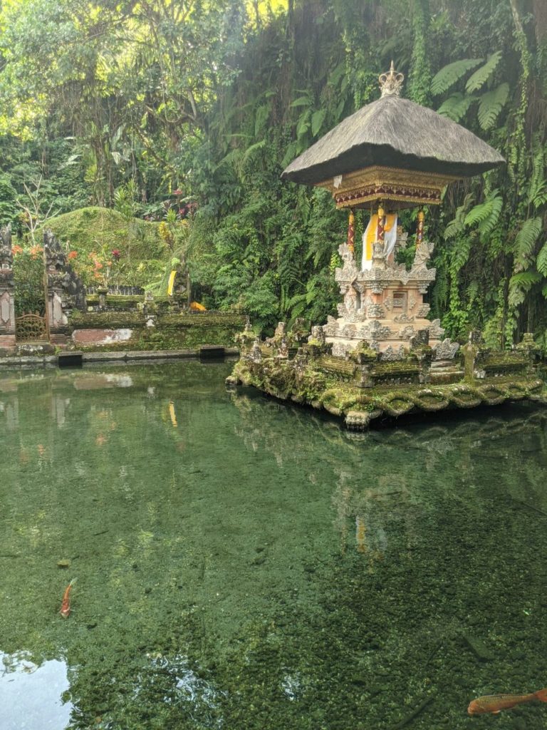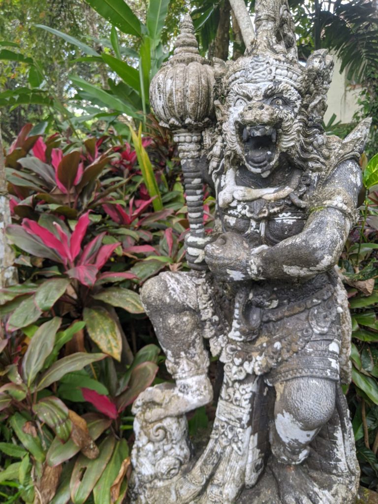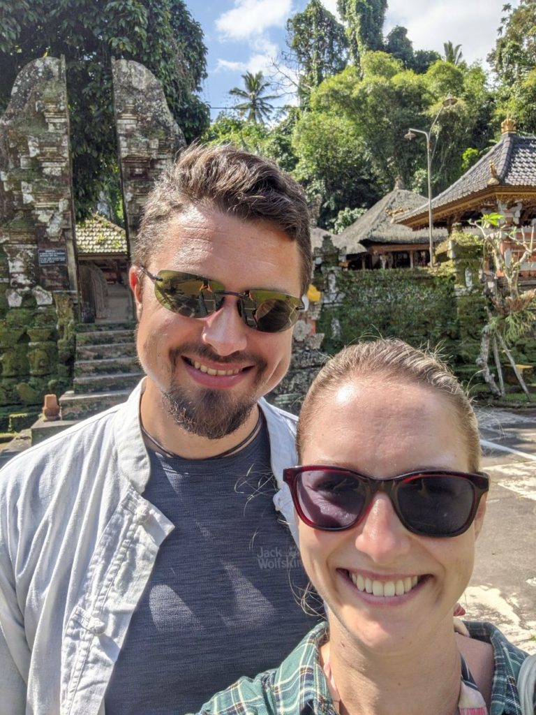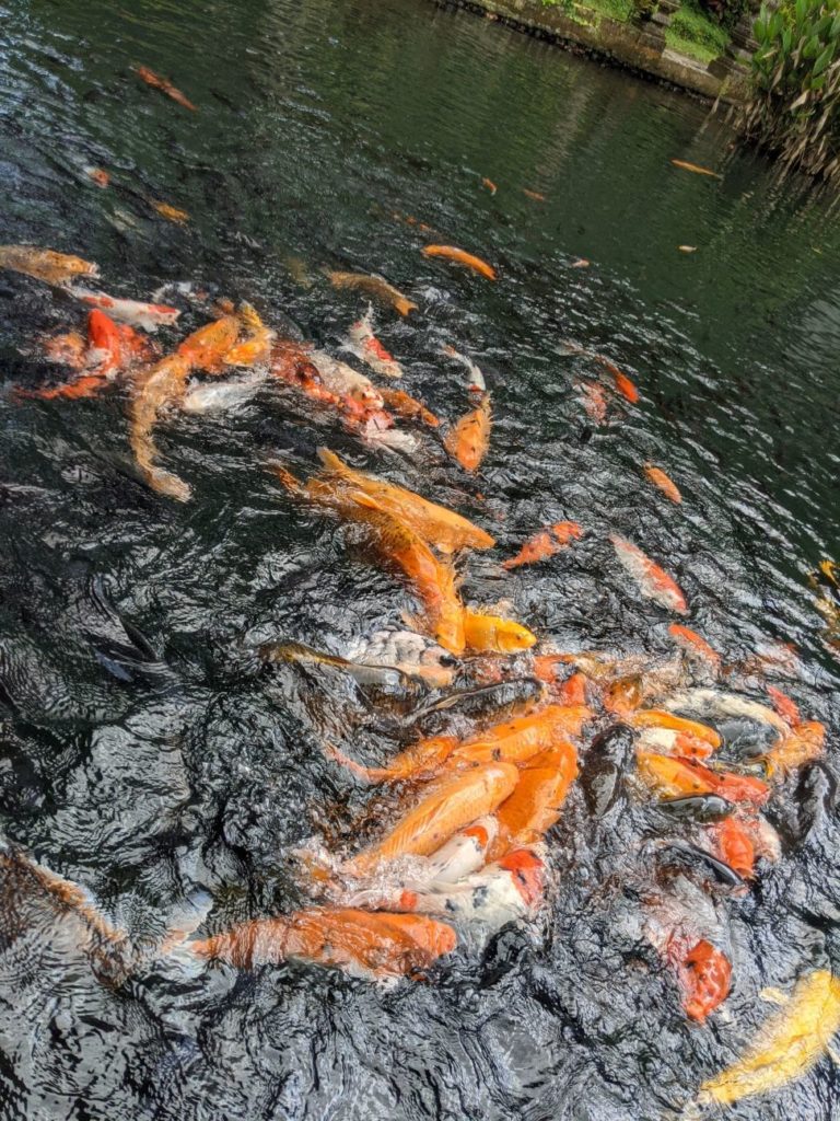 Zwischen Reisterrassen, Wald und Dörfern, die all die Souvenirs für die Läden in den Touristischen Gebieten herstellen hindurch fuhren wir zu einem Wassertempel. „Pura Gunung Kawi Sebatu“ hat uns sehr gut gefallen! Bekleidet mit dem Sarong durften wir die gesamte Tempelanlage betreten und uns in Ruhe umschauen, denn es waren kaum Menschen dort. (Mögen wir ja!) Uns gefallen hier in Bali überall die Steinskulpturen von Göttern und Dämonen wirklich sehr. Hier durften wir auch die vielen und großen Kois im Tempelteich füttern. Äußerst amüsant, weil die Fische sich gegenseitig fast aufgemampft haben! Lieblingssnack gabs dort vor dem Tempel für uns ebenfalls: Bakso 🙂 Heute ist ein besonderer Tag für die Balinesen: Sie feiern ihren Tag der Unabhängigkeit! Deshalb finden heute in allen Dörfern verschiedene Veranstaltungen mit Tänzen und Musik statt. Die Häuser sind seit Wochen mit Fahnen und traditionellen Gestecken geschmückt. (Achtet Mal bei unserem Video ganz unten nach den Bildern darauf! Auf unserem Video seht ihr auch die Reisfelder, Handwerker und Shops, sowie Restaurants.) Nach dem Wassertempel wollten wir auch den bekannteren Wassertempel „Pura Tirta Empul“, drehten allerdings direkt auf dem Parkplatz wieder um, denn es waren Menschenmassen an Touris unterwegs. Also nein, danke! Deshalb beschlossen wir weiter zum „Bird Park“ zu fahren. Da war Google jedoch kein prickelnder Navigator. Wir fuhren irgendwie dran vorbei…landeten aber bei der Rettungsstation für die Vögel. Diese gibt es noch nicht allzu lange und neben der Auffangstation gab es ein kleines Restaurant, in dem wir einen zweiten Mittagssnack bekamen. Vögel gab es allerdings keine für uns zu sehen, denn diese kommen erst gegen 18 Uhr abends zurück in die Bäume. Außerdem beginnt die Brutzeit erst im Oktober und auch die tatsächliche Arbeit der Station. Sie kümmern sich um die Kücken, die aus den Nestern hoch oben in den Bäumen gefallen sind und peppeln sie wieder auf, bis sie selbst fliegen können. Hannes fütterte auch hier die Fische im Teich, die teilweise als Futter für die Vögel dienen. Die Vögel brüten dort schon seit Mitte der 60er Jahre, da sie im Dorf vor Schlangen auf den Bäumen mehr geschützt sind als im Wald. Nach einem netten Pläuschchen mit einem Angestellten beeilen wir uns etwas heim zu kommen: Regen kündigte sich wieder an. Wir schafften es noch rechtzeitig, den Scooter abzugeben, bisschen Snacks für die Tage einzukaufen und uns auf unsere Terrasse vor dem Bungalow zu setzen, als es erneut wie aus Kübeln goss. Wir stießen mit unserem Bier an (Bintang und Singaraja) und bestellten uns Essen. Welche gute Entscheidung, denn im Regen wären wir ja noch nass geworden 😀 Übrigens hatten wir netten Besuch von zwei Fledermäusen. Prost!