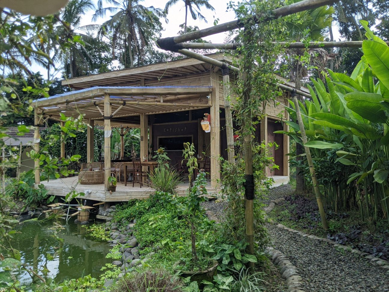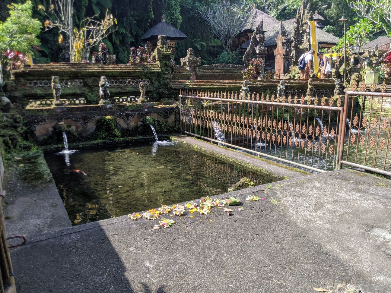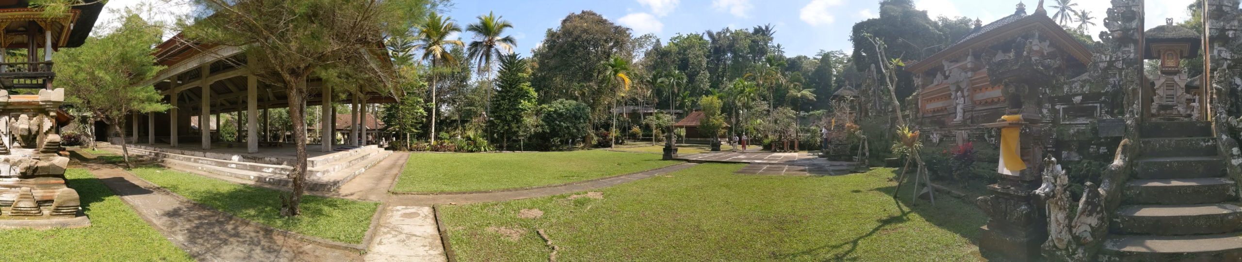 Zwischen Reisterrassen, Wald und Dörfern, die all die Souvenirs für die Läden in den Touristischen Gebieten herstellen hindurch fuhren wir zu einem Wassertempel. „Pura Gunung Kawi Sebatu“ hat uns sehr gut gefallen! Bekleidet mit dem Sarong durften wir die gesamte Tempelanlage betreten und uns in Ruhe umschauen, denn es waren kaum Menschen dort. (Mögen wir ja!) Uns gefallen hier in Bali überall die Steinskulpturen von Göttern und Dämonen wirklich sehr. Hier durften wir auch die vielen und großen Kois im Tempelteich füttern. Äußerst amüsant, weil die Fische sich gegenseitig fast aufgemampft haben! Lieblingssnack gabs dort vor dem Tempel für uns ebenfalls: Bakso 🙂 Heute ist ein besonderer Tag für die Balinesen: Sie feiern ihren Tag der Unabhängigkeit! Deshalb finden heute in allen Dörfern verschiedene Veranstaltungen mit Tänzen und Musik statt. Die Häuser sind seit Wochen mit Fahnen und traditionellen Gestecken geschmückt. (Achtet Mal bei unserem Video ganz unten nach den Bildern darauf! Auf unserem Video seht ihr auch die Reisfelder, Handwerker und Shops, sowie Restaurants.) Nach dem Wassertempel wollten wir auch den bekannteren Wassertempel „Pura Tirta Empul“, drehten allerdings direkt auf dem Parkplatz wieder um, denn es waren Menschenmassen an Touris unterwegs. Also nein, danke! Deshalb beschlossen wir weiter zum „Bird Park“ zu fahren. Da war Google jedoch kein prickelnder Navigator. Wir fuhren irgendwie dran vorbei…landeten aber bei der Rettungsstation für die Vögel. Diese gibt es noch nicht allzu lange und neben der Auffangstation gab es ein kleines Restaurant, in dem wir einen zweiten Mittagssnack bekamen. Vögel gab es allerdings keine für uns zu sehen, denn diese kommen erst gegen 18 Uhr abends zurück in die Bäume. Außerdem beginnt die Brutzeit erst im Oktober und auch die tatsächliche Arbeit der Station. Sie kümmern sich um die Kücken, die aus den Nestern hoch oben in den Bäumen gefallen sind und peppeln sie wieder auf, bis sie selbst fliegen können. Hannes fütterte auch hier die Fische im Teich, die teilweise als Futter für die Vögel dienen. Die Vögel brüten dort schon seit Mitte der 60er Jahre, da sie im Dorf vor Schlangen auf den Bäumen mehr geschützt sind als im Wald. Nach einem netten Pläuschchen mit einem Angestellten beeilen wir uns etwas heim zu kommen: Regen kündigte sich wieder an. Wir schafften es noch rechtzeitig, den Scooter abzugeben, bisschen Snacks für die Tage einzukaufen und uns auf unsere Terrasse vor dem Bungalow zu setzen, als es erneut wie aus Kübeln goss. Wir stießen mit unserem Bier an (Bintang und Singaraja) und bestellten uns Essen. Welche gute Entscheidung, denn im Regen wären wir ja noch nass geworden 😀 Übrigens hatten wir netten Besuch von zwei Fledermäusen. Prost!